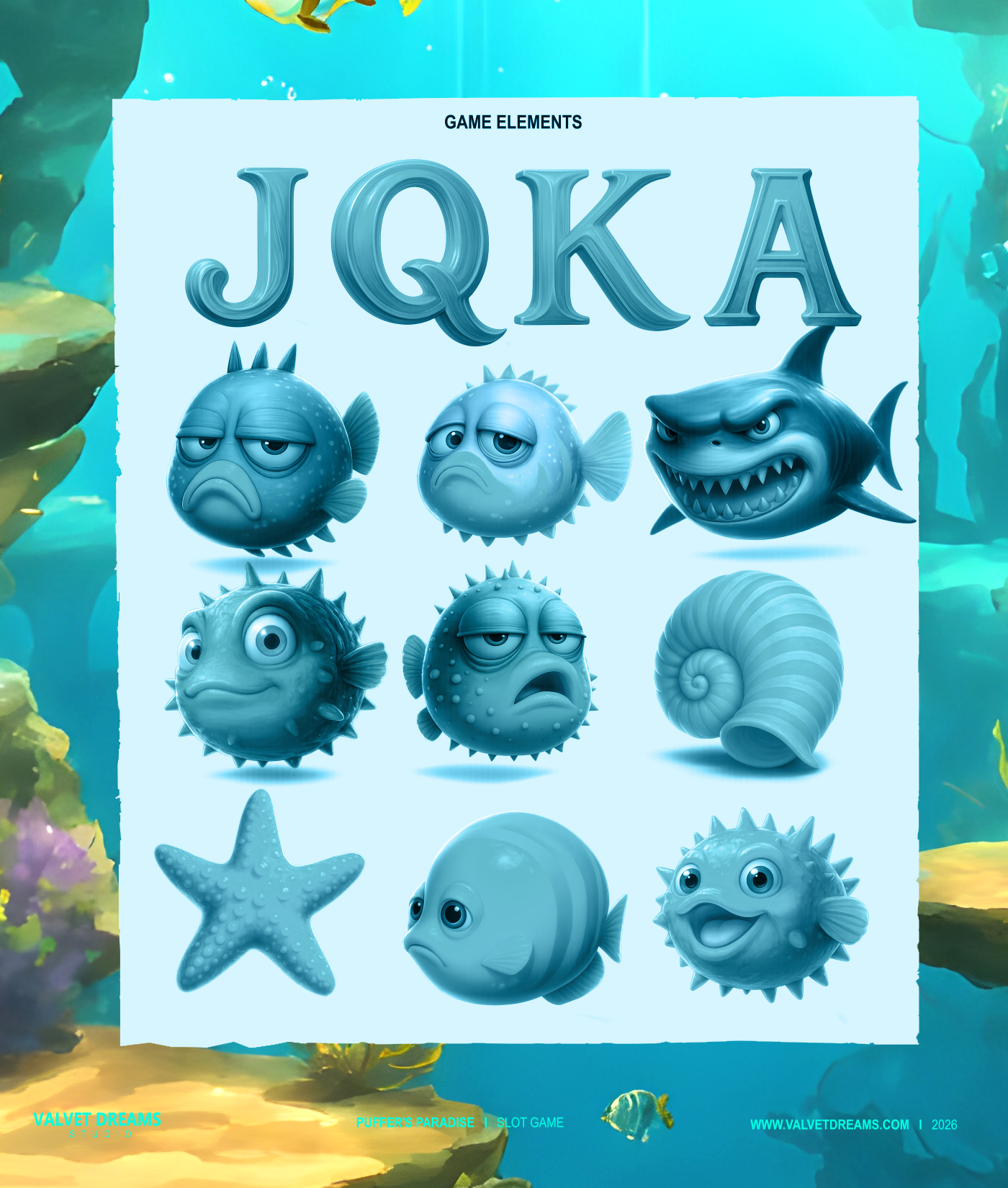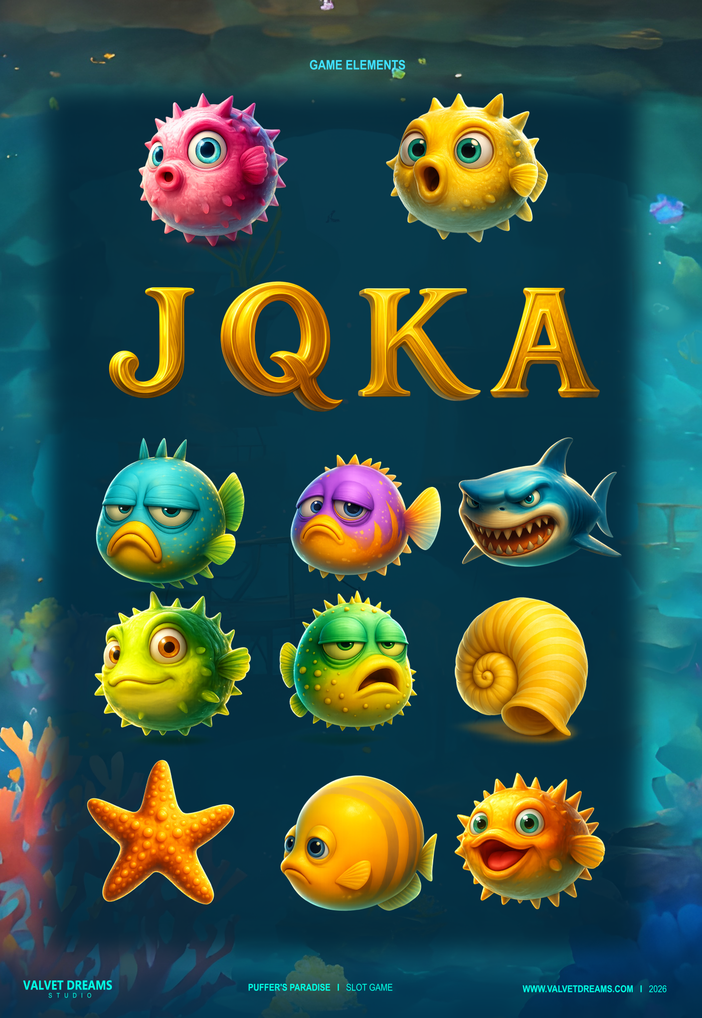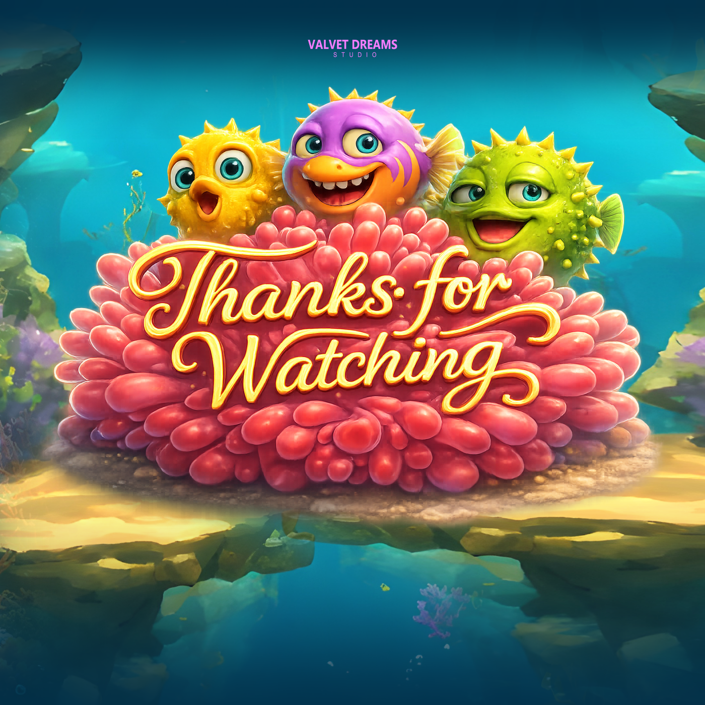 A cheerful underwater adventure led by a funny, cartoon-style puffer fish.