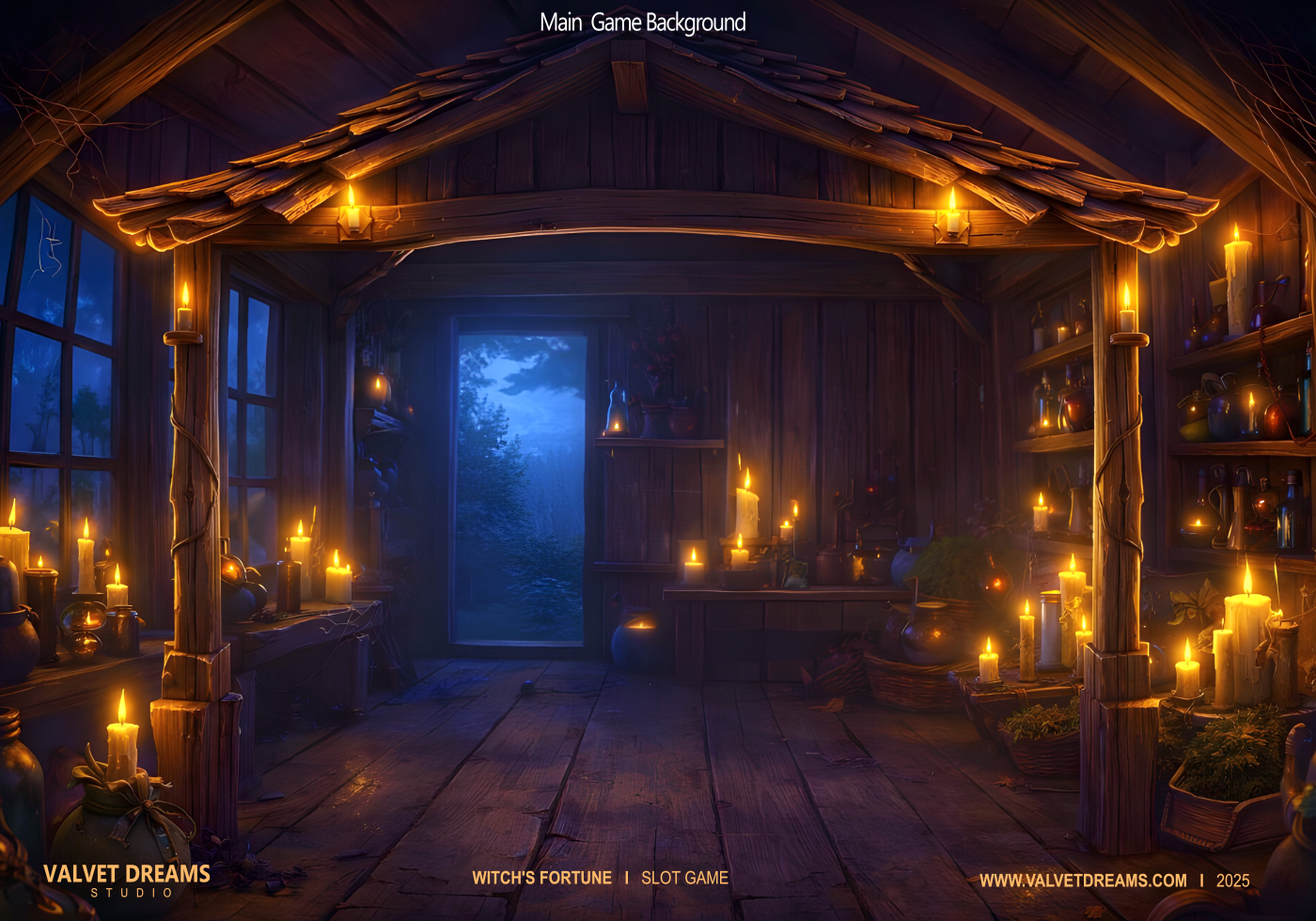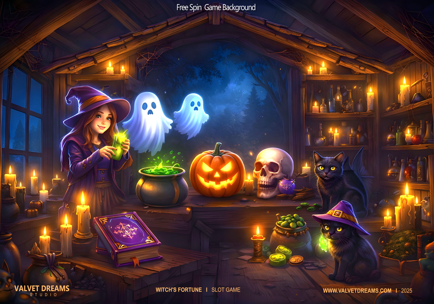 Dark potions, glowing symbols, and enchanted reels set the mood.
